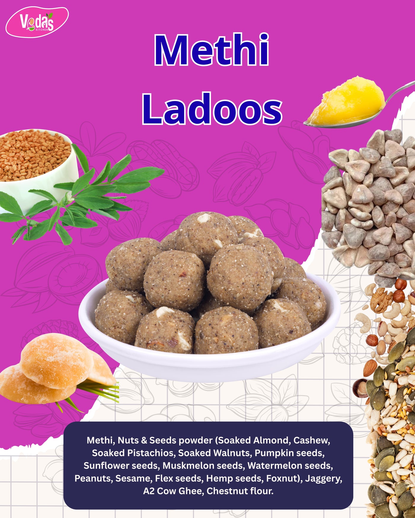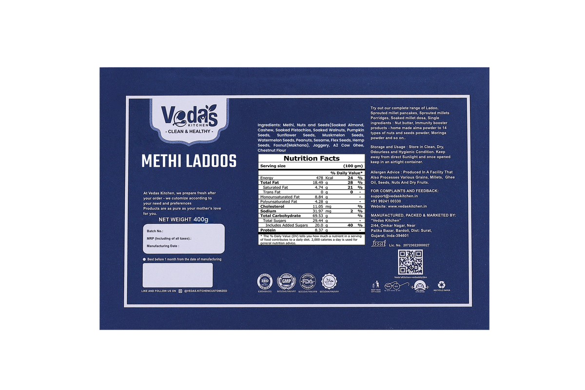 A powerful, traditional ladoo made with Methi, A2 cow ghee (Bilona) and a rich blend of soaked nuts and seeds. Crafted to support strength, digestion, postpartum healing, and overall nourishment — just like homemade.